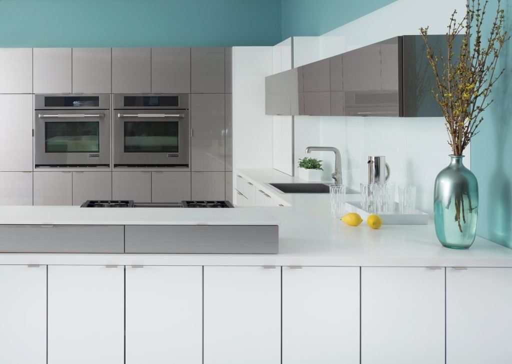 By design, a two-tone edgebanding was selected for the White Acrylic doors to coordinate with the Mercury Wired Foil doors.