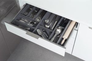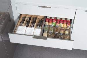 As more and more homeowners opt for contemporary styling, Dura Supreme has developed a stainless steel drawer system so that the cabinet interior is as sleek as the cabinet exterior.
