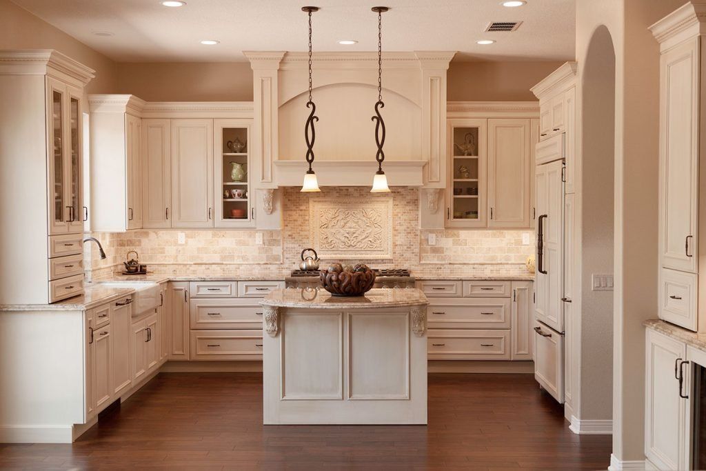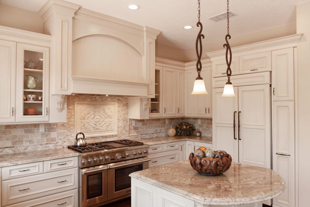 The Mediterranean style of this kitchen is embodied through ornate details in the cabinetry, molding, tile, fixtures, and hardware. The decorative details in the cabinets including the detailed edges and complex frames contribute to the intricate Mediterranean style. The bronze cabinet handles contrast the antique white cabinet doors and add more detail to this design. The backsplash accent tile was handmade, custom for this kitchen and it fits elegantly as a major centerpiece for the room. All of these elements contribute to the intricate look and intentional design of this Mediterranean inspired kitchen.