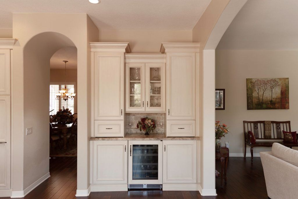 The homeowner opted for a lighter color scheme, so Alana helped her choose cabinets finished with an antique white espresso glaze. The granite countertops and tumbled travertine backsplash include an array of hues from soft ivory to rich gold. Many of the appliances, including the refrigerator, the dishwasher, and the wine cooler, are fitted with custom panels to match the white cabinets throughout the space. These lighter colors in the cabinetry and the countertops contrast the dark engineered wood flooring in this room, and the natural lighting enhances how these colors look in this space.