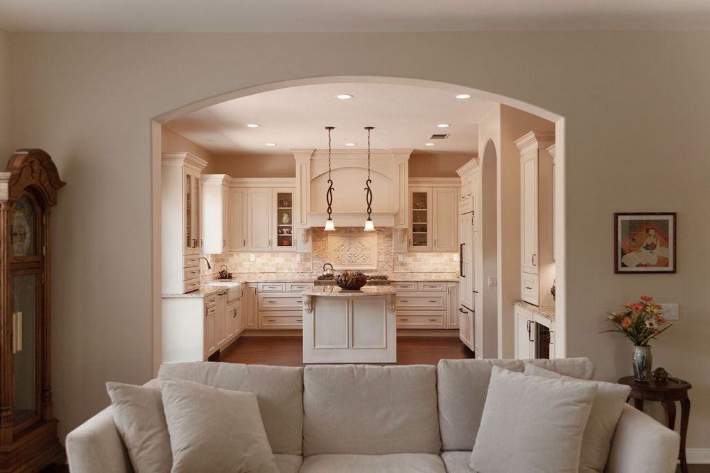 The room itself is expansive, and a large archway connects the kitchen with the living room, adding to the luxurious feel of this home. The natural lighting that flows in through the door and window brightens up the room and complements the subtle canned lighting in the celling. These details create an already lavish atmosphere, and the Mediterranean kitchen style enhances the look of this space.