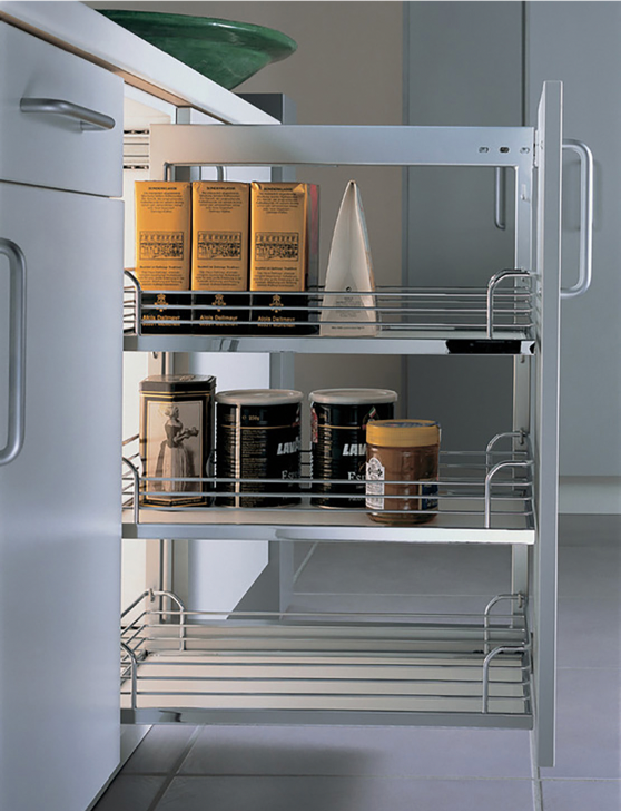 Creating drawers within drawers can maximize space in deep drawers. A top layer may be used for cutlery, below is a second drawer for dishes and below that is another drawer for pots and pans. These drawers within drawers slide individually with the top-drawer housing items used most often.