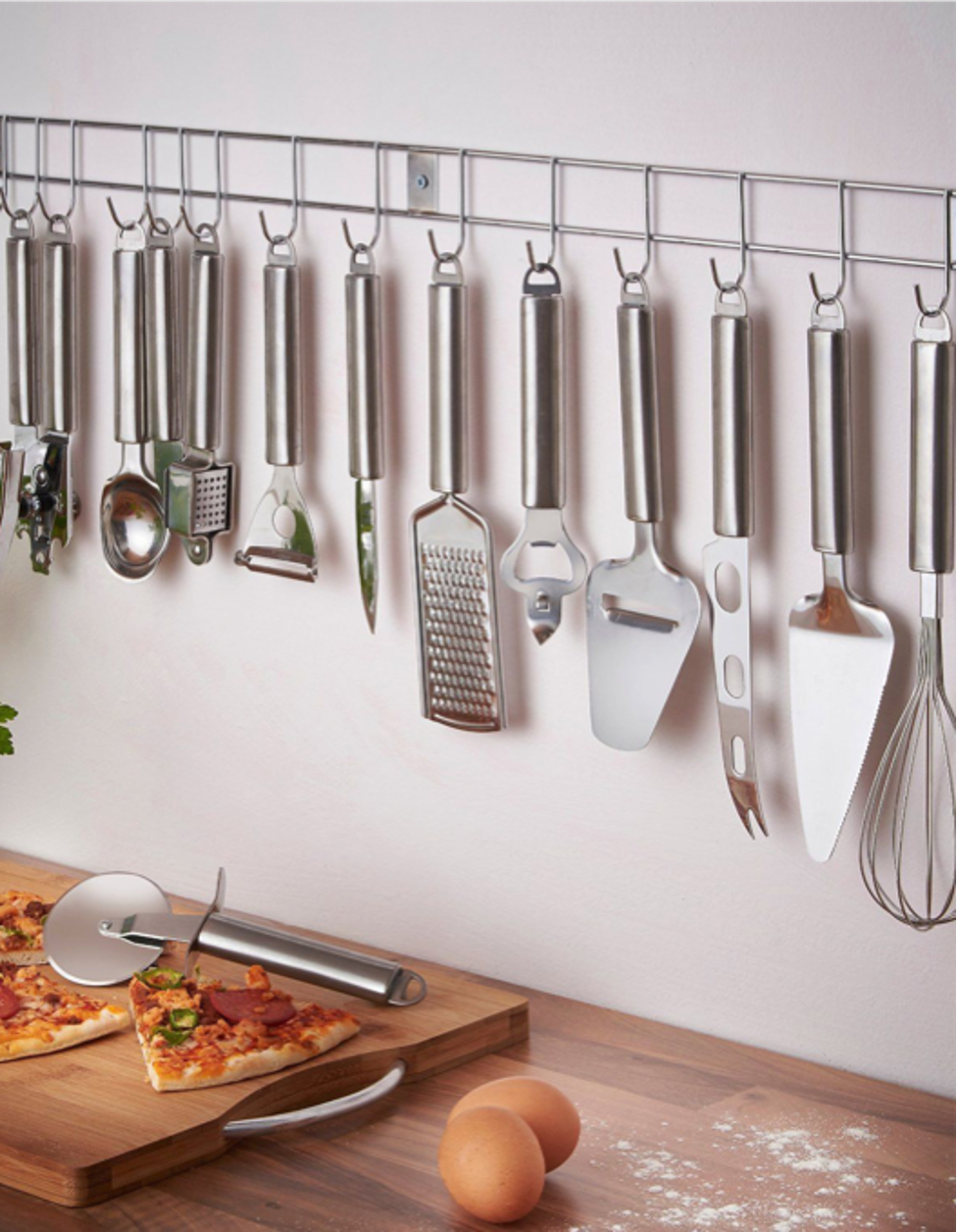 Utensils can be stored as part of an open shelving system, housing them in jars or open vessels, which is an ideal venue for the items you use most often. Hanging rails are another option for storing and displaying utensils that not only make an aesthetic statement, but also keep items used most often easily accessible.