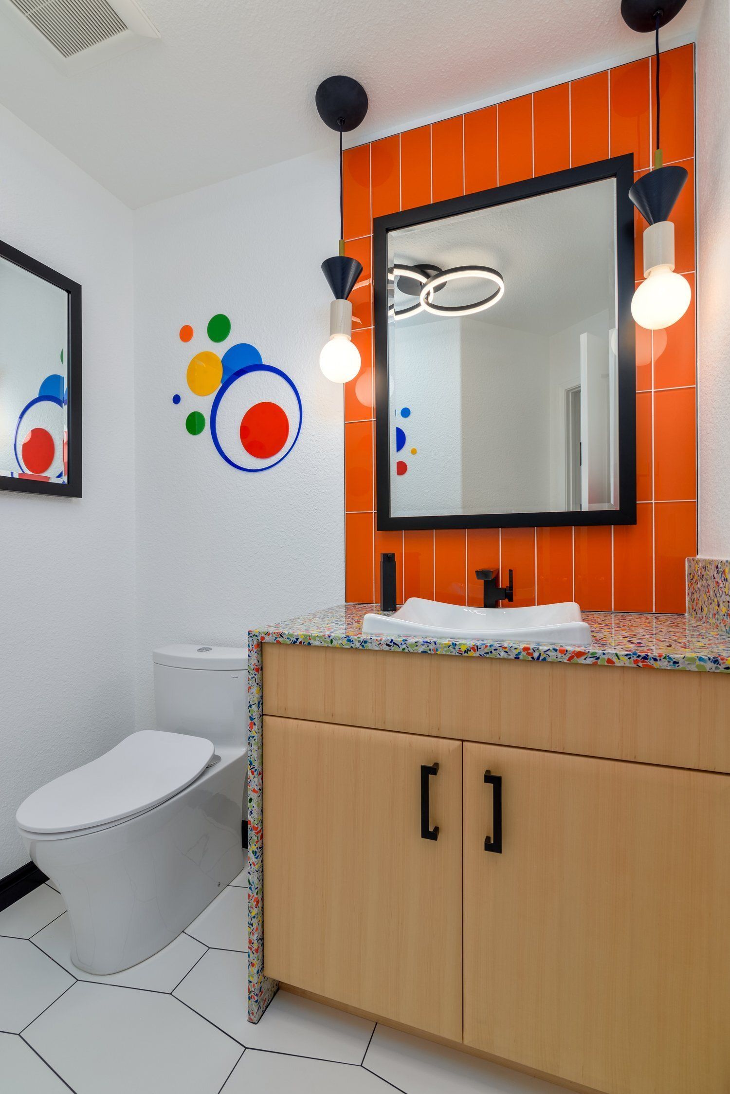 Orange Patterned Recycled Glass Inspires Powder Bathroom