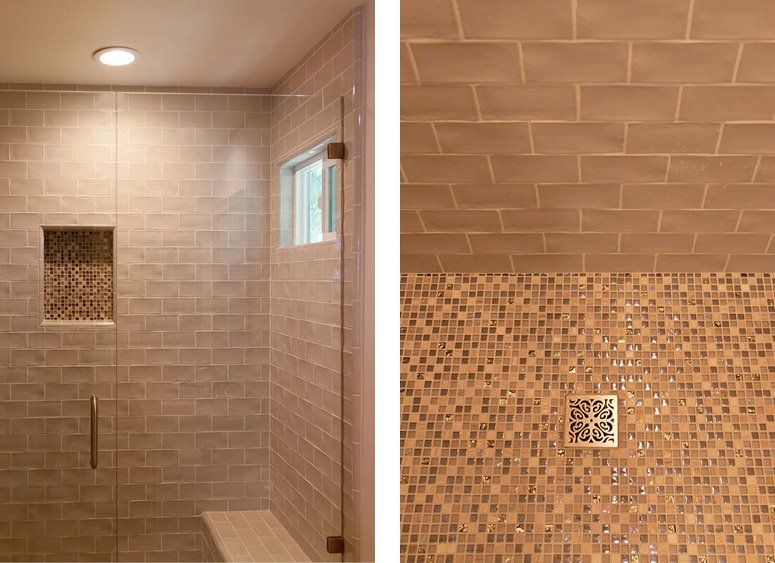 In the guest bathroom, we added a window in the shower at the homeowners’ request. To add some color and style, glass mosaic tile brightens up the shower flooring and adds a touch of style on the recessed shower shelf. A decorative shower drain with a traditional look completes this shower space and links the traditional style of the rest of the bathroom with the shower.