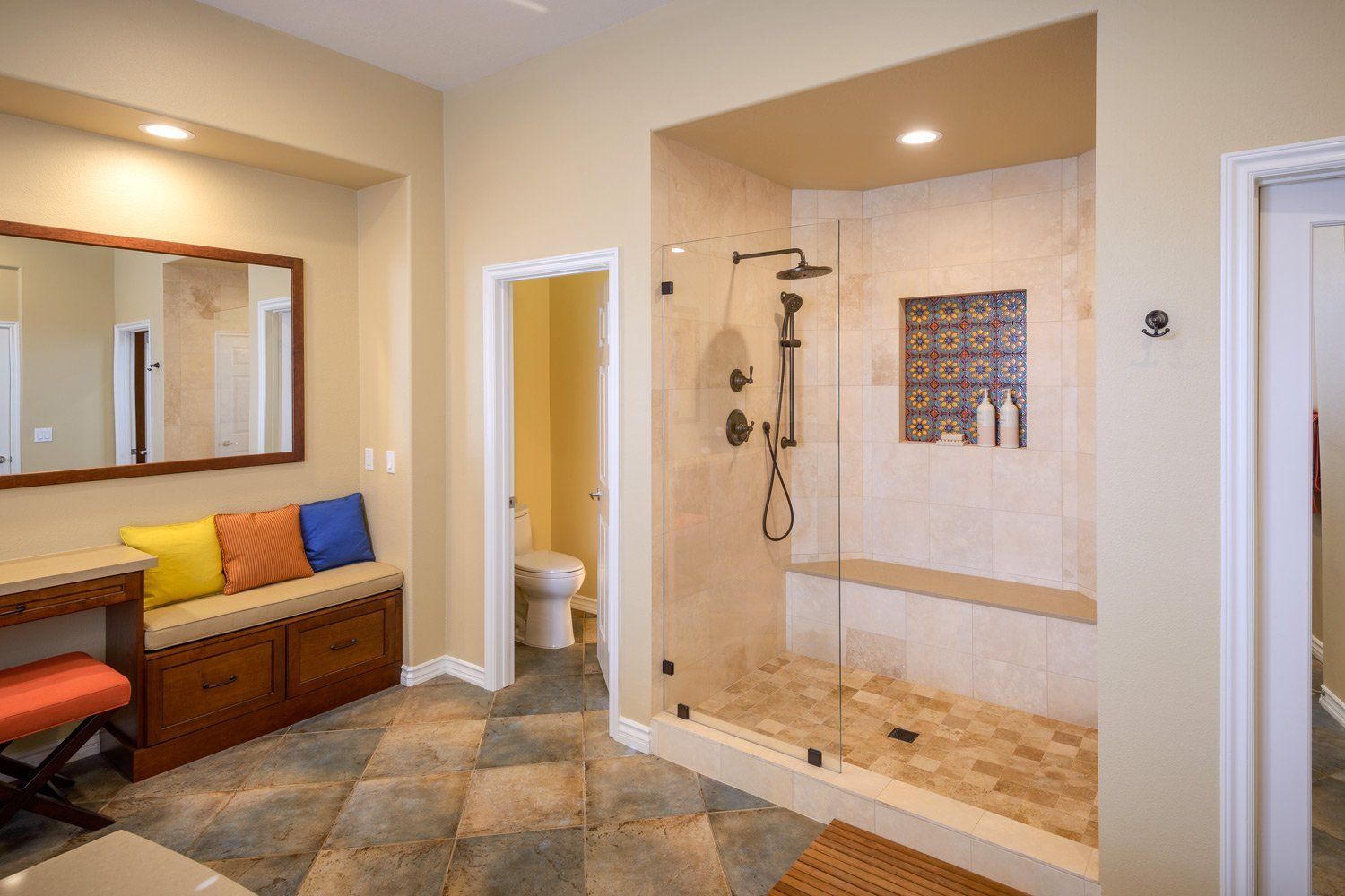 This large and colorful Mediterranean style master bathroom features a unique layout with a spa tub in the center of the room, vanities with sinks on each side, and a large alcove shower. Other highlights include the handsome make-up vanity, a storage cabinet with seating, and coordinating framed mirrors. The decorative tiles placed throughout the space bring bold color and vibrant personality to this artistic, one-of-a-kind master bathroom.
