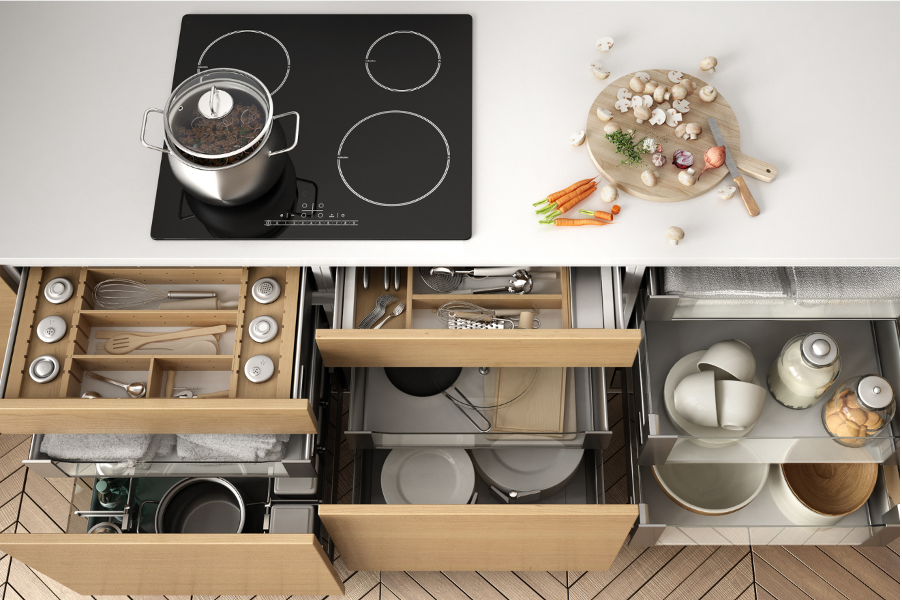 Drawer organizers and pull out storage have an impact on kitchens and bathrooms. The kitchen has deep drawers with dividers for easy access to utensils, spices, and gadgets, as well as pull out pantry shelves to give more cupboard space. Having pull out shelves or baskets in cabinets in the bathroom helps keep belongings tidy and easily accessible.
