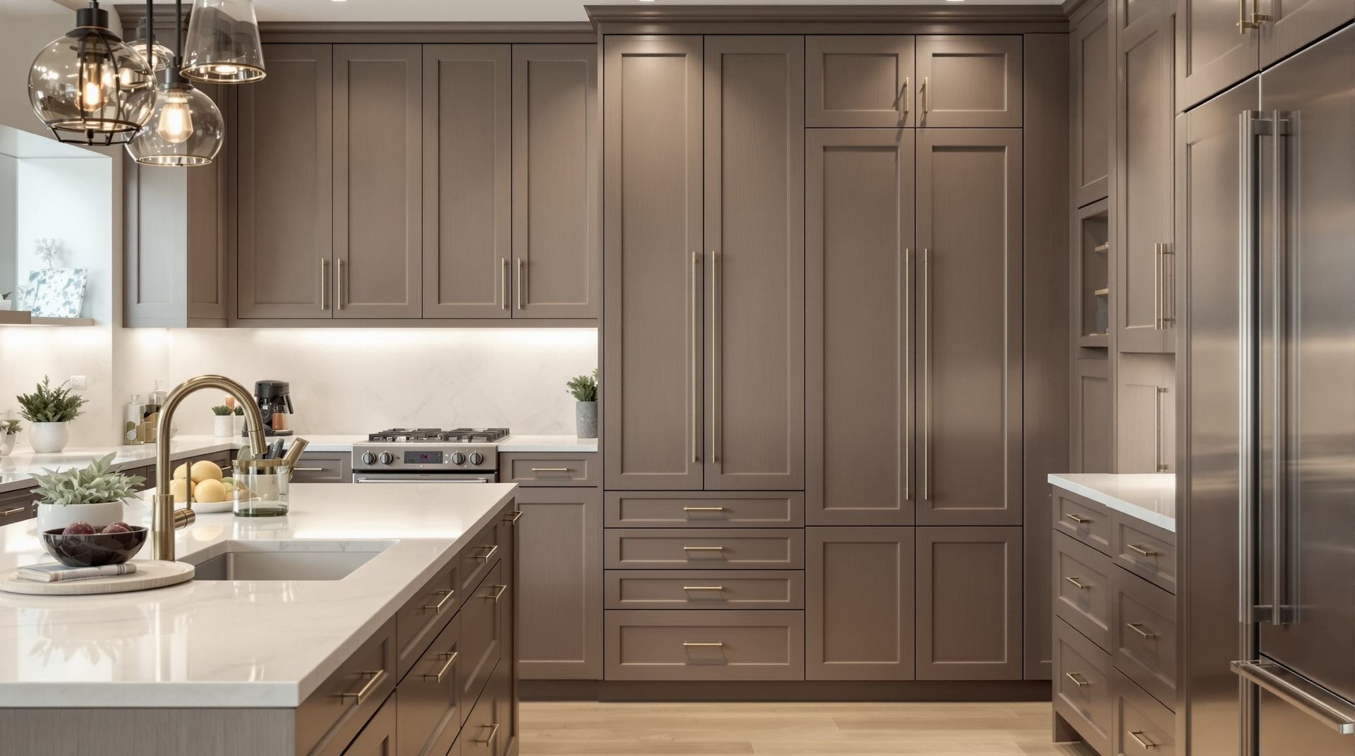 Cabinet finishes today are designed to handle everyday wear. Painted cabinets remain popular, especially in soft whites, warm neutrals, and natural wood tones.