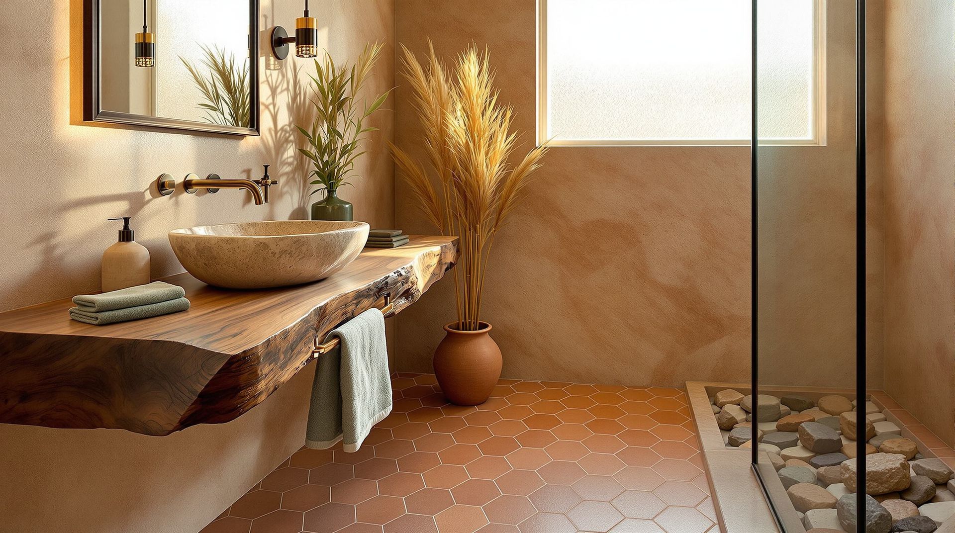 Small changes like a stone vanity top, a wood-framed mirror, or textured tile on a single wall can transform the room. Even woven storage or warm-toned hardware adds a subtle outdoor feel.