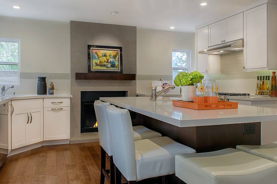Three windows in the original family room were made smaller so the kitchen cabinets could fit above them. To increase wall space, the original sliding glass door was changed to a single lite French door. The once red-brick fireplace, newly faced with porcelain tile that mimic the look of concrete, provides a welcoming atmosphere in the kitchen.