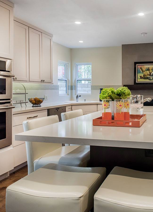 Virginia loves to host parties and entertain, and so her goal was that her kitchen be designed for entertaining. Her solution was to relocate her kitchen to the larger space that was once the family room and then create a comfortable lounge where the original kitchen was once positioned. The two spaces now integrate seamlessly, providing an easy flow for guests.